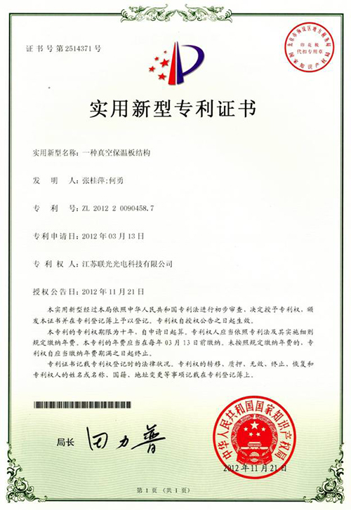 一種真空保溫板結(jié)構(gòu)實(shí)用新型專利證書-百特榮譽(yù)